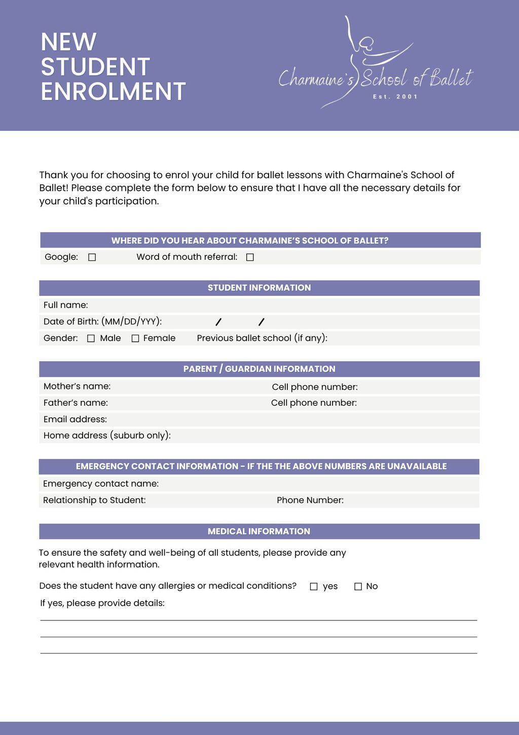 Please click on the button below to download our enrolment form. Please complete all sections and e-mail to charmaine@schoolofballet.co.za.